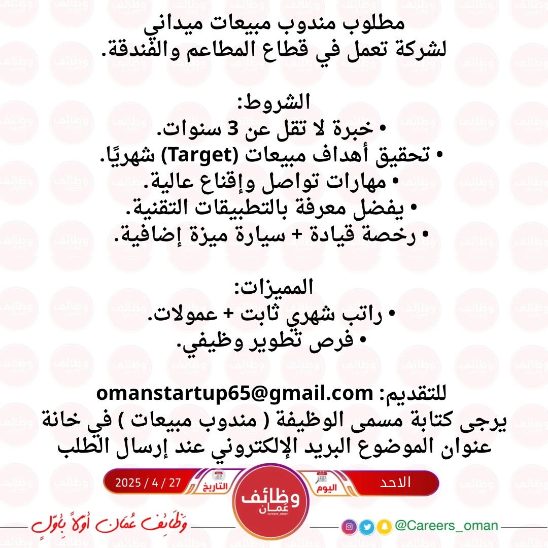 شركة تعمل في قطاع المطاعم والفندقة - وظيفة شاغرة ( مندوب مبيعات )