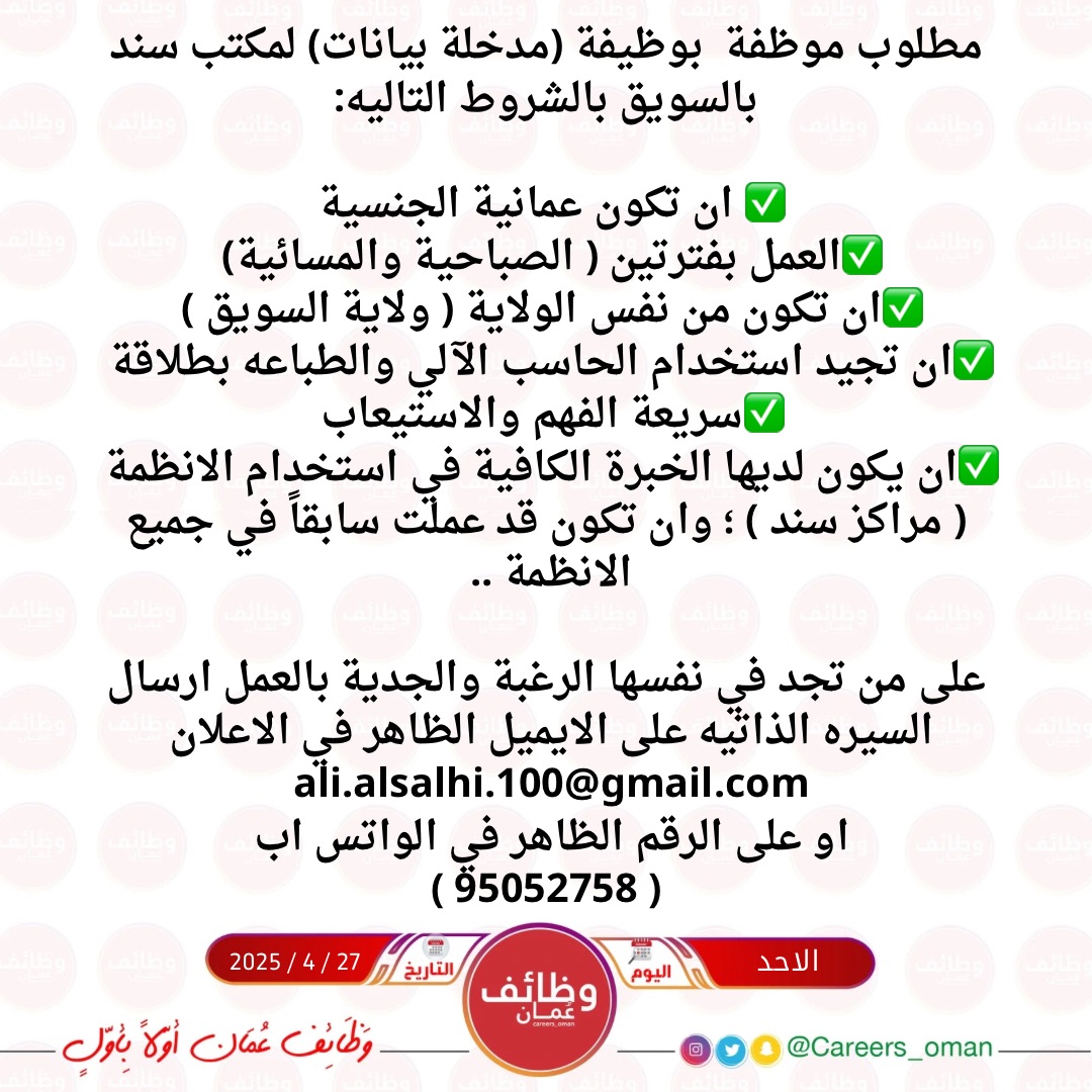 مكتب سند بالسويق - وظيفة شاغرة ( مدخلة بيانات )