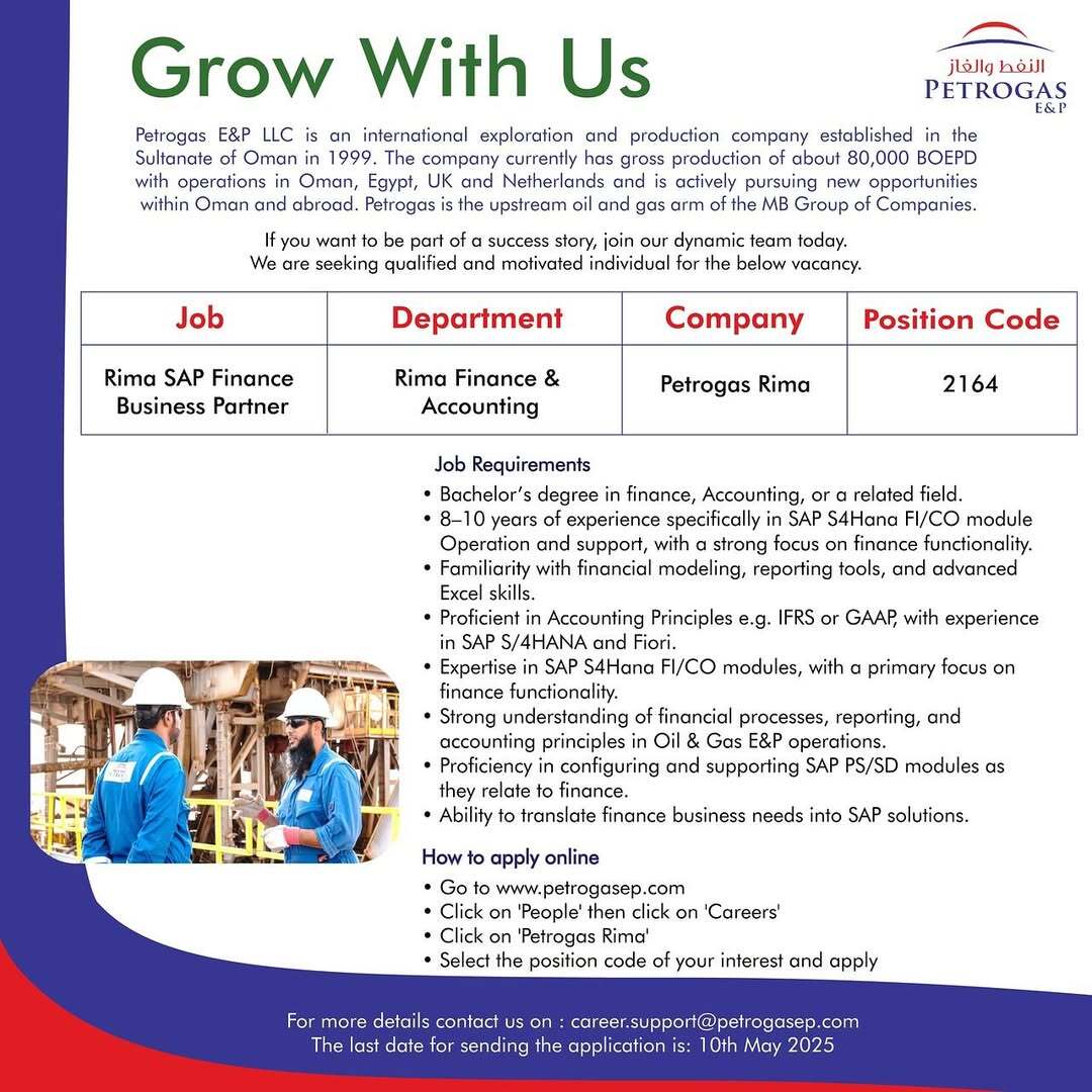 شركة النفط والغاز Petrogas - وظيفة شاغرة ( Rima SAP Finance Business Partner )