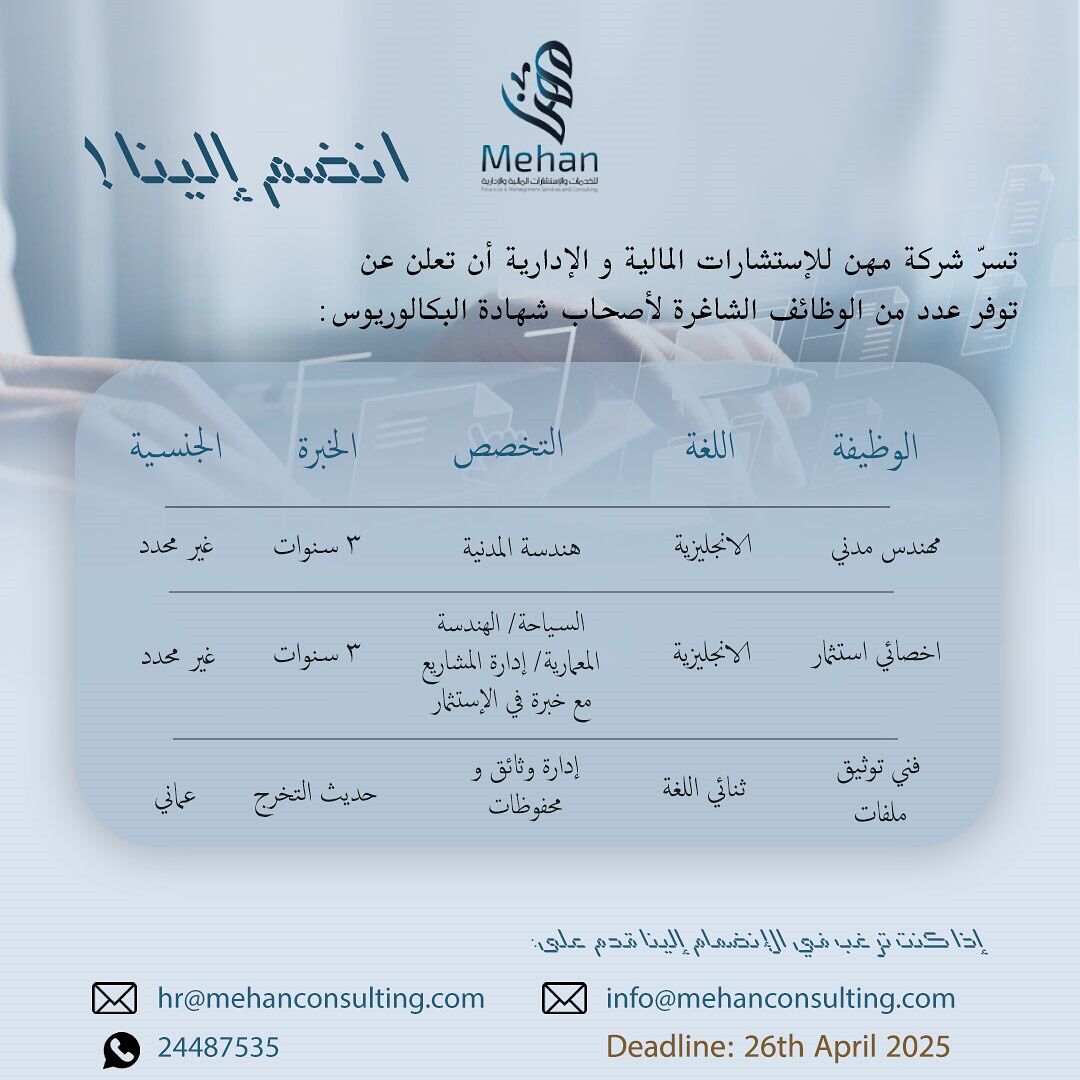 شركة مهن للاستشارات المالية والإدارية - وظائف شاغرة