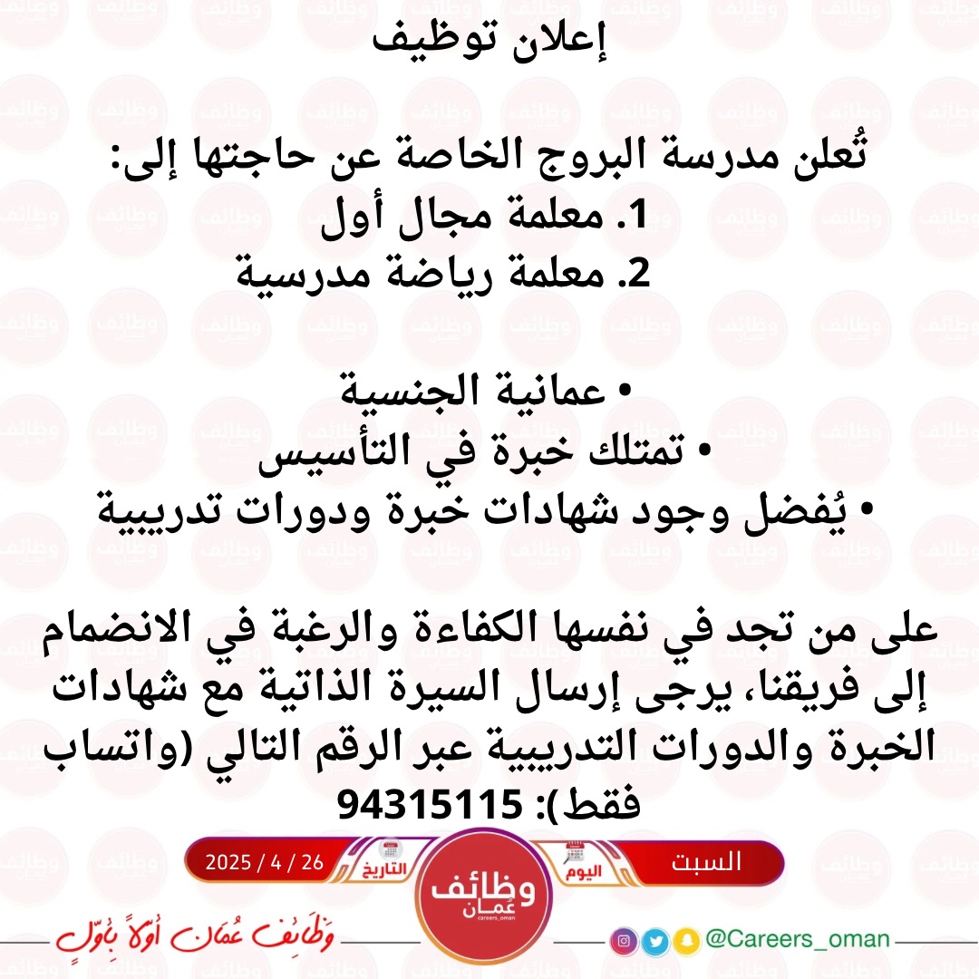 مدرسة البروج الخاصة - فرص شاغرة ( معلمة مجال اول + معلمة رياضة مدرسية )