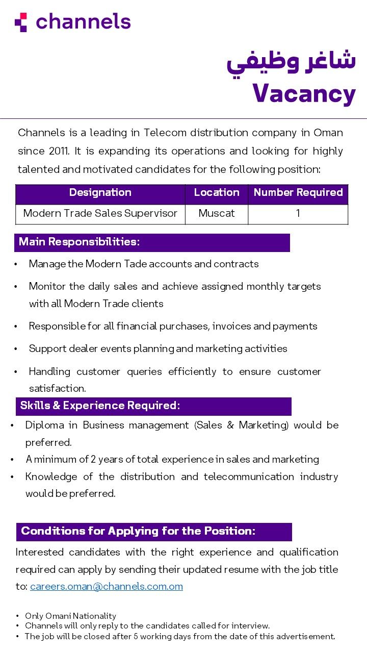 شركة channels في مسقط - وظيفة شاغرة ( Modern Trade Sales Supervisor )