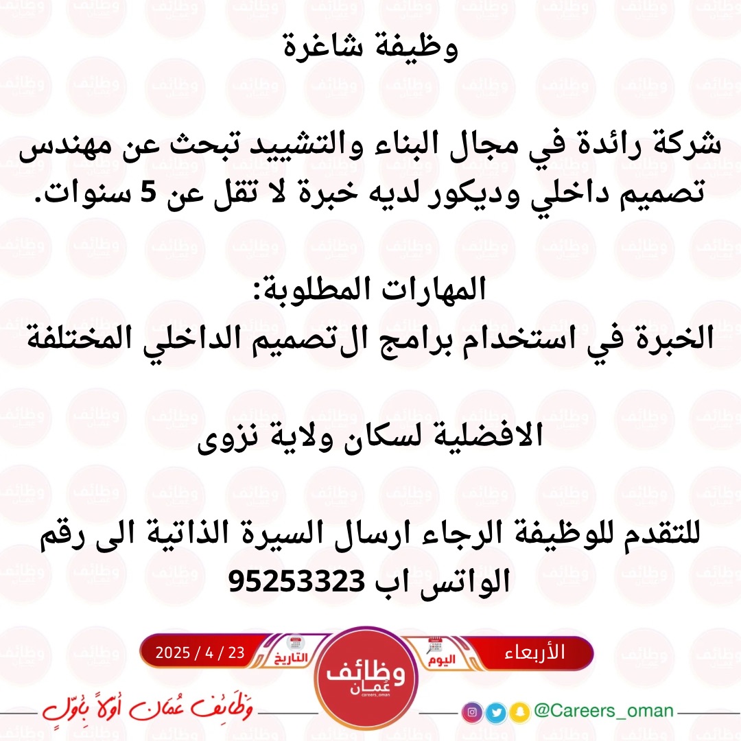شركة رائدة في مجال البناء والتشييد في نزوى - وظيفة شاغرة ( مهندس تصميم داخلي وديكور )