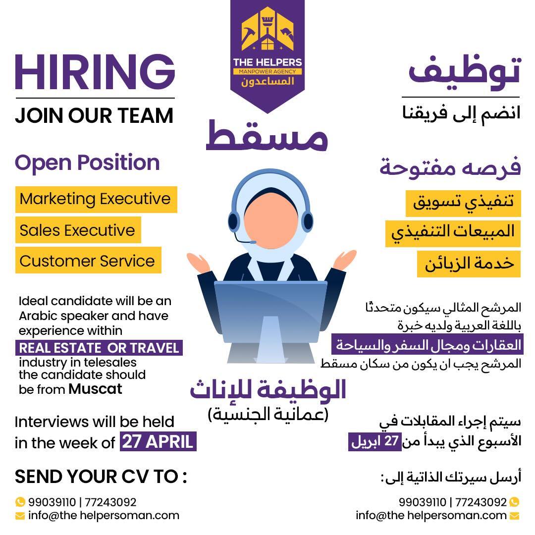 مكتب المساعدون - وظائف شاغرة ( تنفيذي تسويق + المبيعات التنفيذي + خدمة الزبائن )