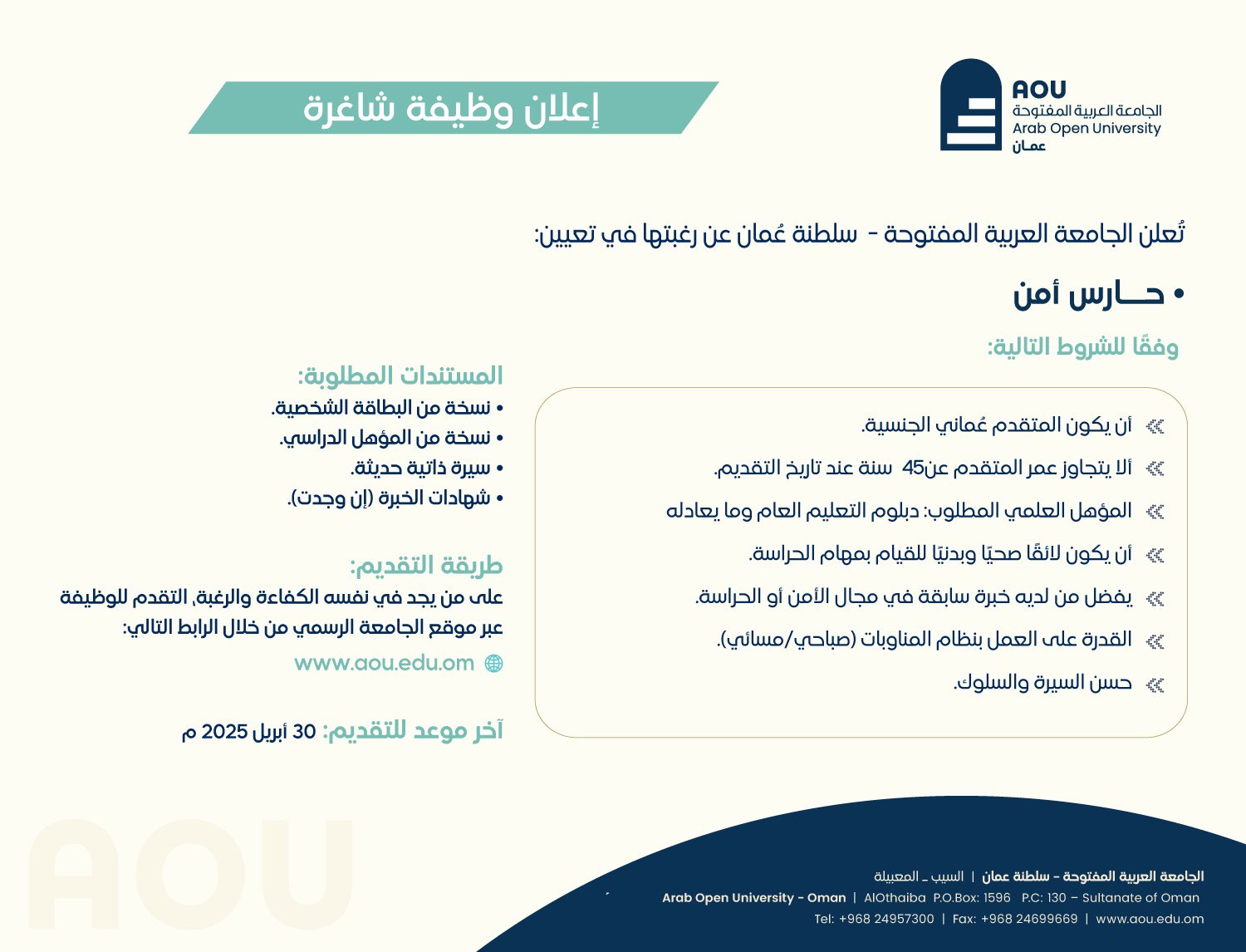 الجامعة العربية المفتوحة - وظيفة شاغرة ( حارس أمن )