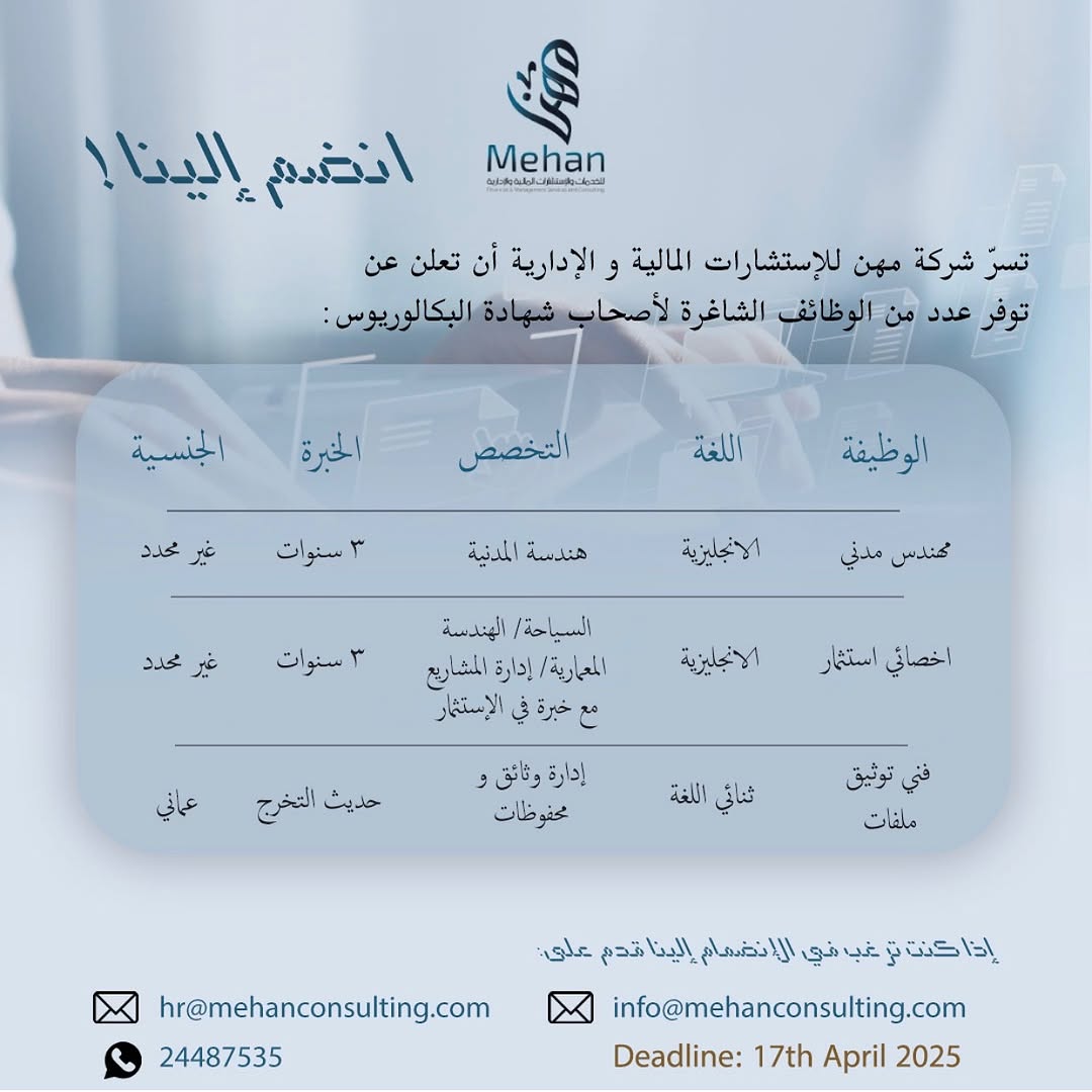 شركة مهن للاستشارات المالية والإدارية - وظائف شاغرة
