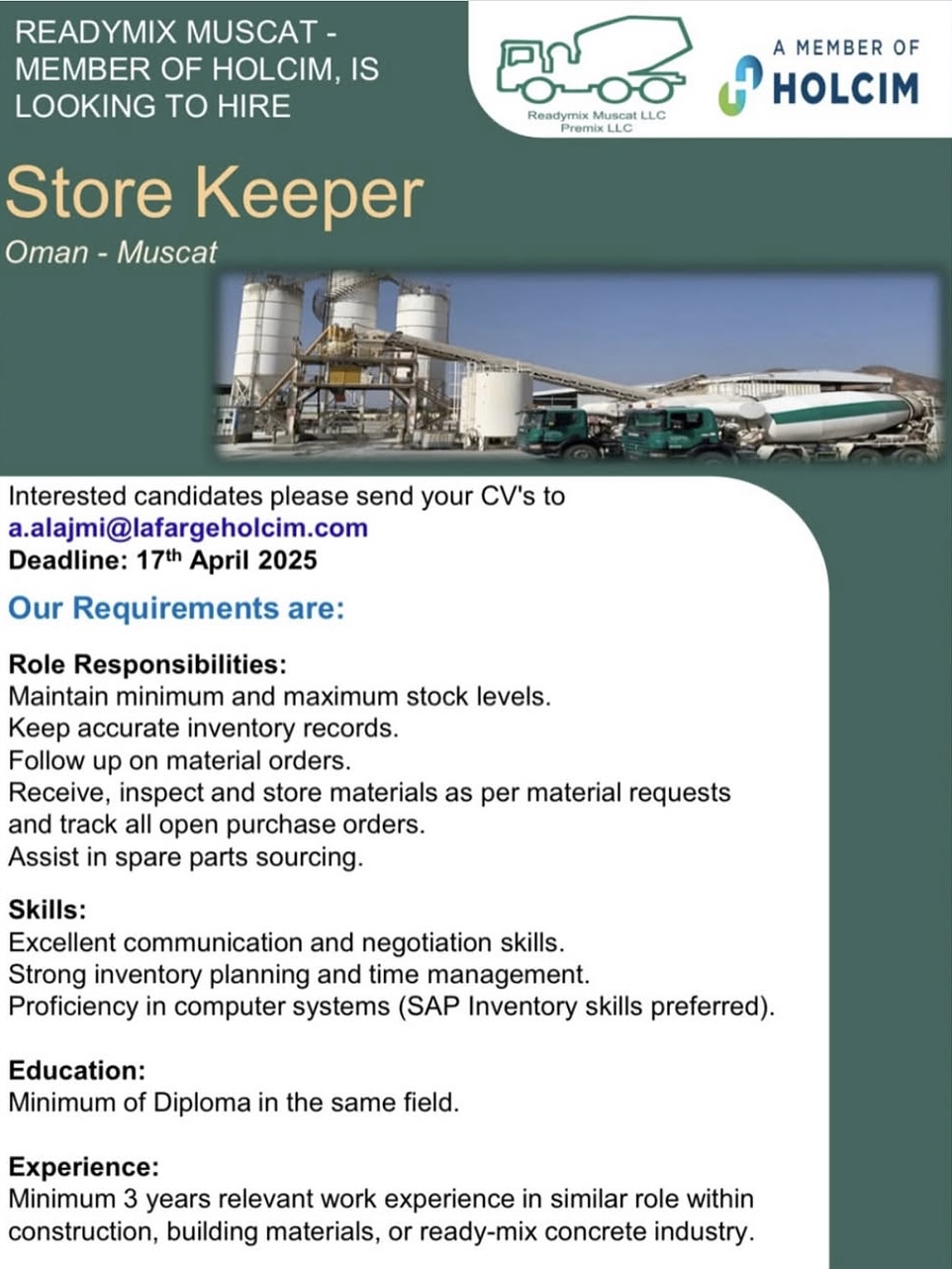 شركة مسقط ردي مكس - وظيفة شاغرة ( أمين مستودع )