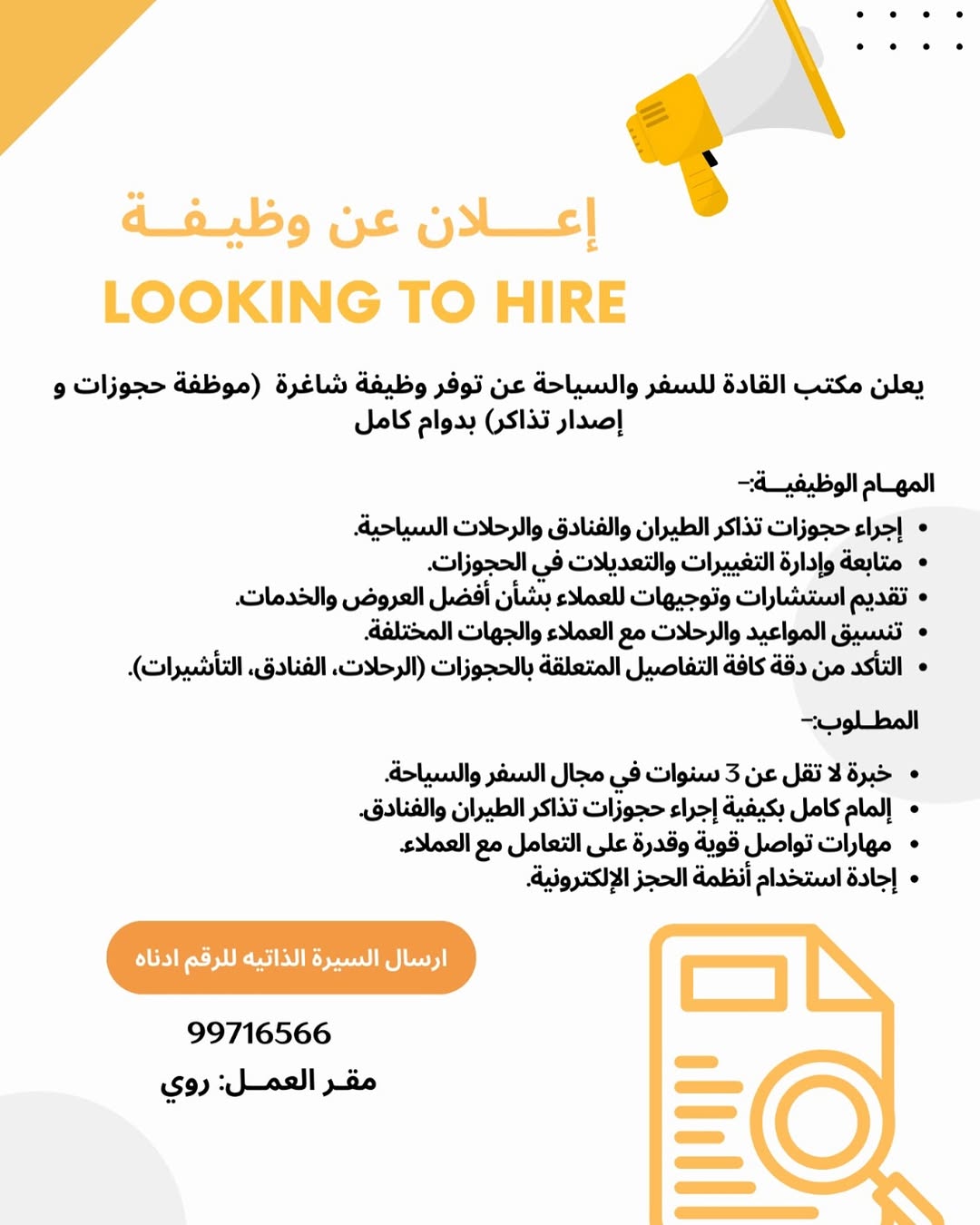 مكتب القادة للسفر والسياحة في روي - وظيفة شاغرة ( موظفة حجوزات وإصدار التذاكر )