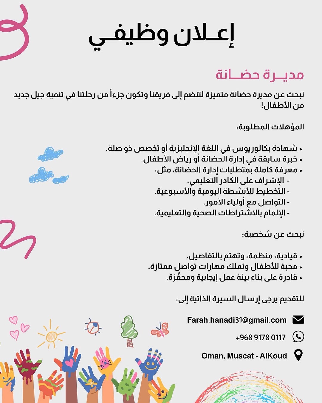 حضانة خاصة في الخوض - وظيفة شاغرة ( مديرة حضانة )