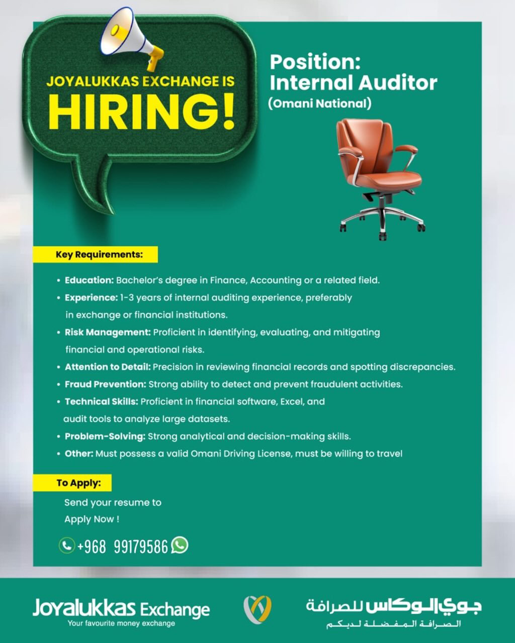 جوي الوكاس للصرافة - وظيفة شاغرة ( Internal Auditor )