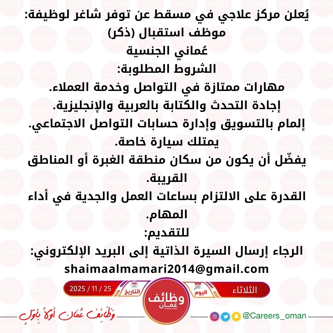 مركز علاجي في مسقط - وظيفة شاغرة ( موظف استقبال )