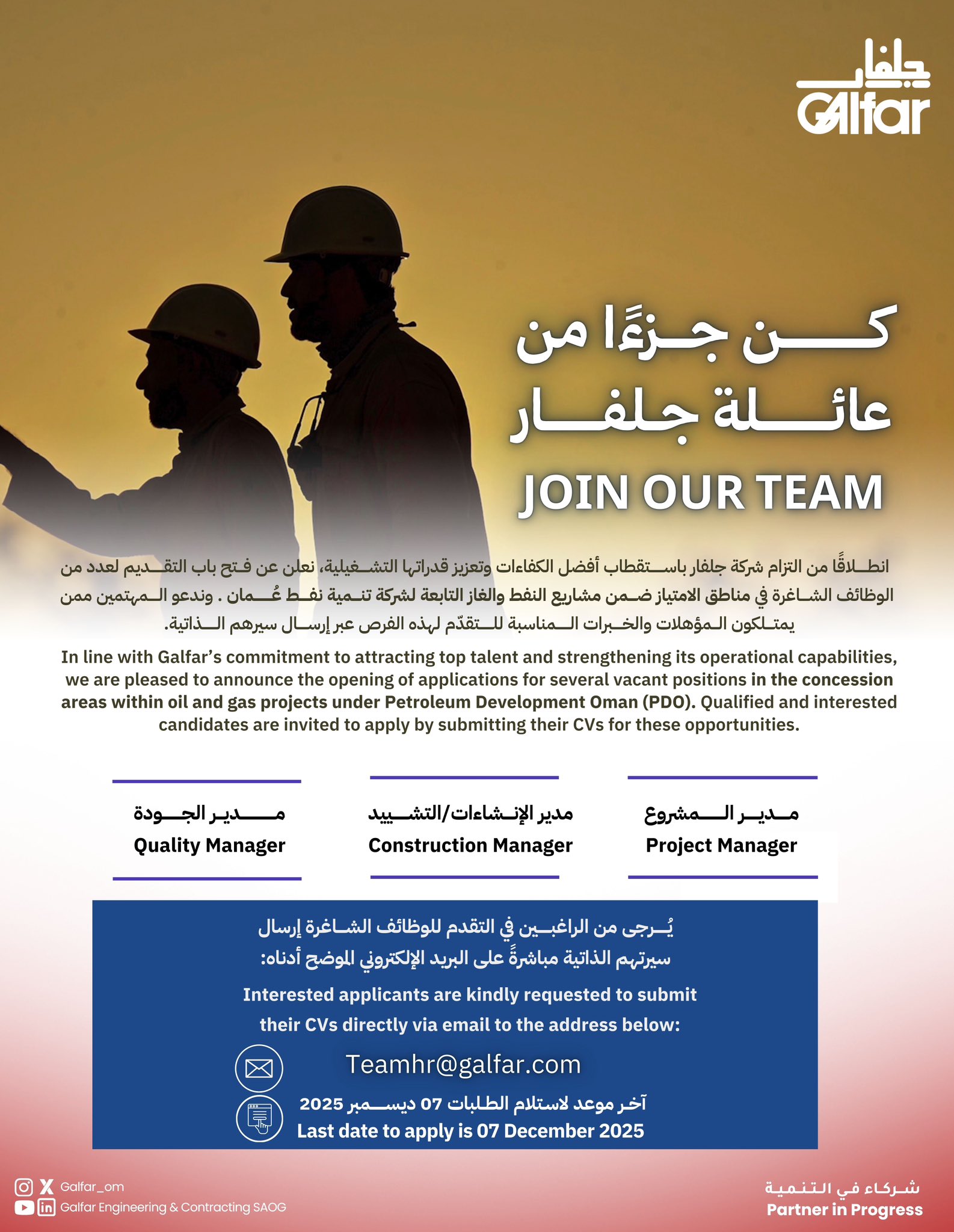 شركة جلفار - وظائف شاغرة في مشاريع النفط والغاز ضمن مناطق الامتياز