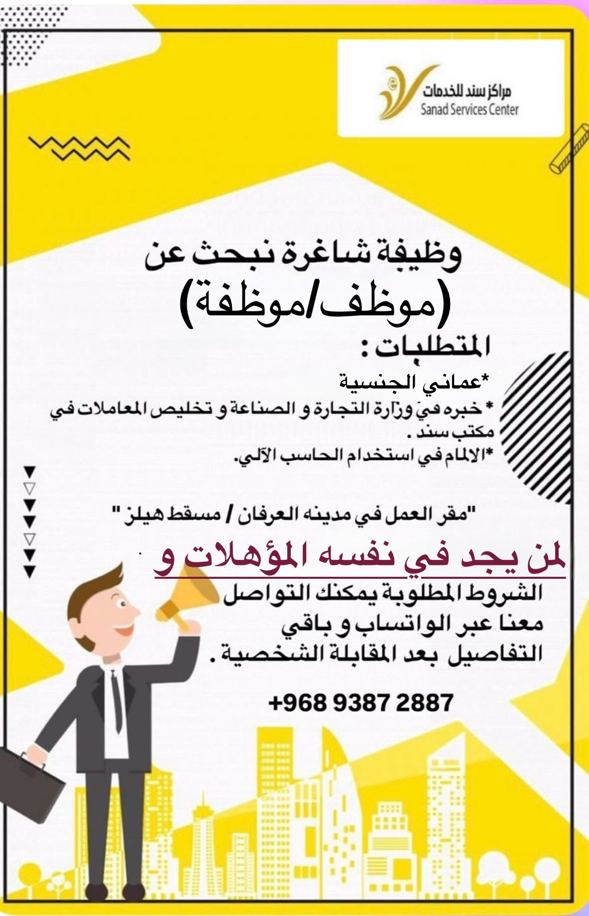 مكتب سند للخدمات في مسقط هيلز - وظيفة شاغرة ( موظف / موظفة )