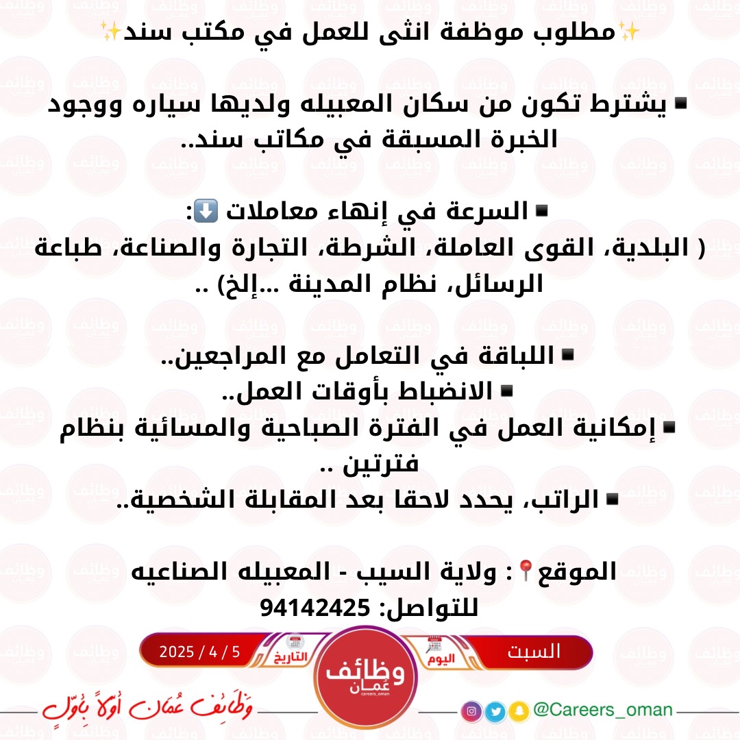 مكتب سند في المعبيلة - وظيفة شاغرة ( موظفة )