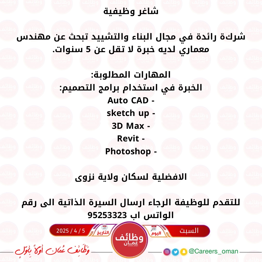 شركة رائدة في مجال البناء والتشييد في نزوى - وظيفة شاغرة ( مهندس معماري )