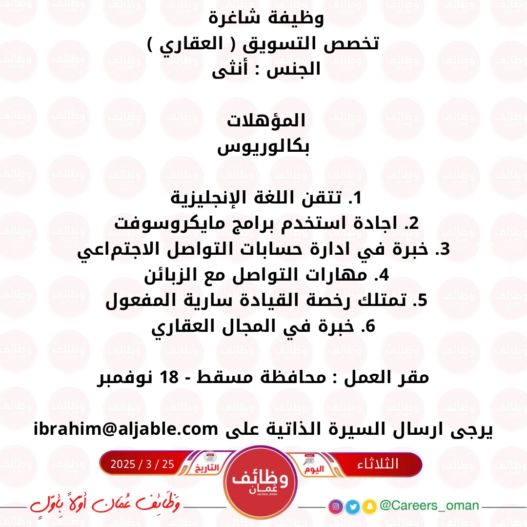 شركة رائدة في مسقط - وظيفة شاغرة ( التسويق العقاري )