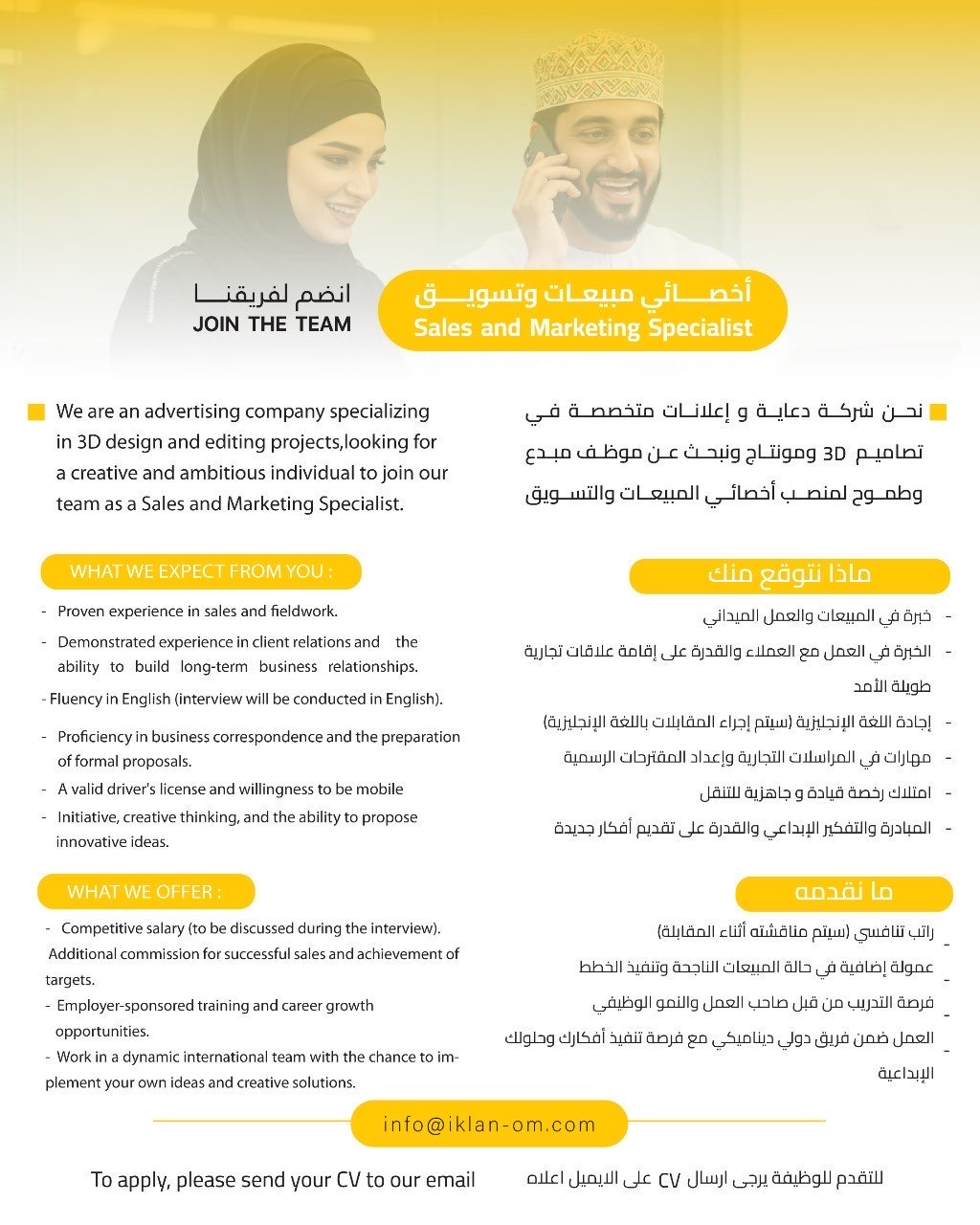 شركة دعاية وإعلانات - وظيفة شاغرة ( أخصائي مبيعات والتسويق )