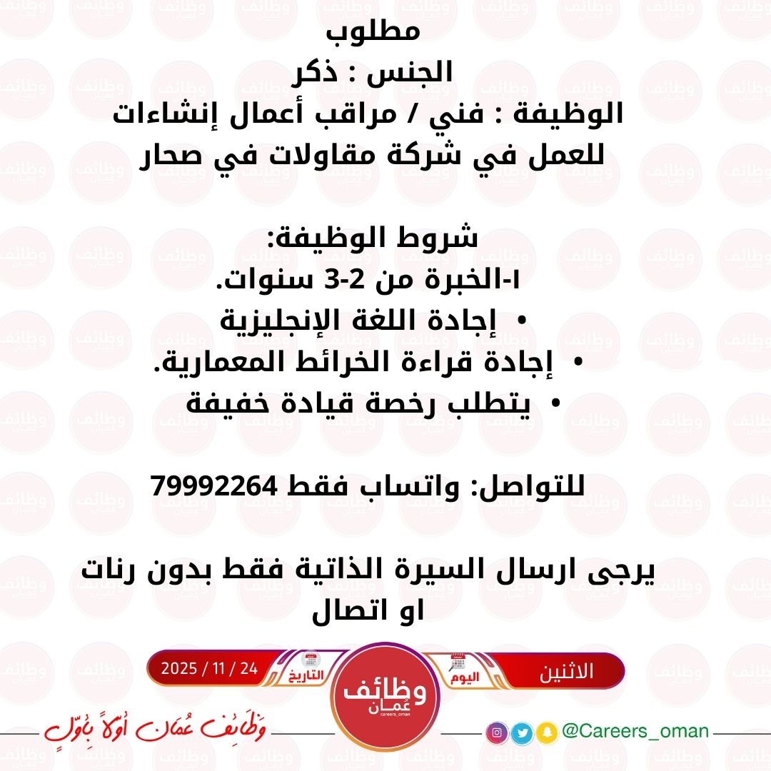 شركة مقاولات في صحار - وظيفة شاغرة ( فني / مراقب أعمال إنشاءات )