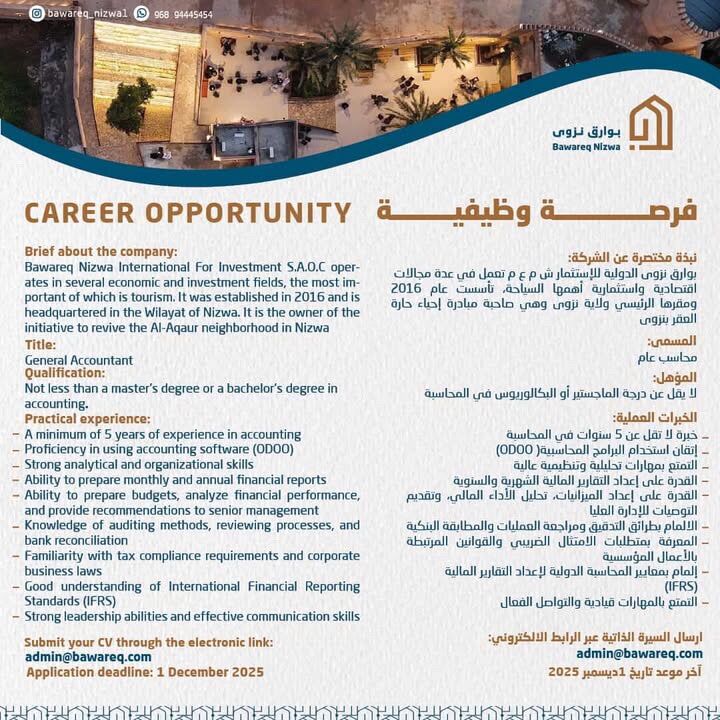 بوارق نزوى الدولية للاستثمار - فرص وظيفية شاغرة ( محاسب + محاسب عام )
