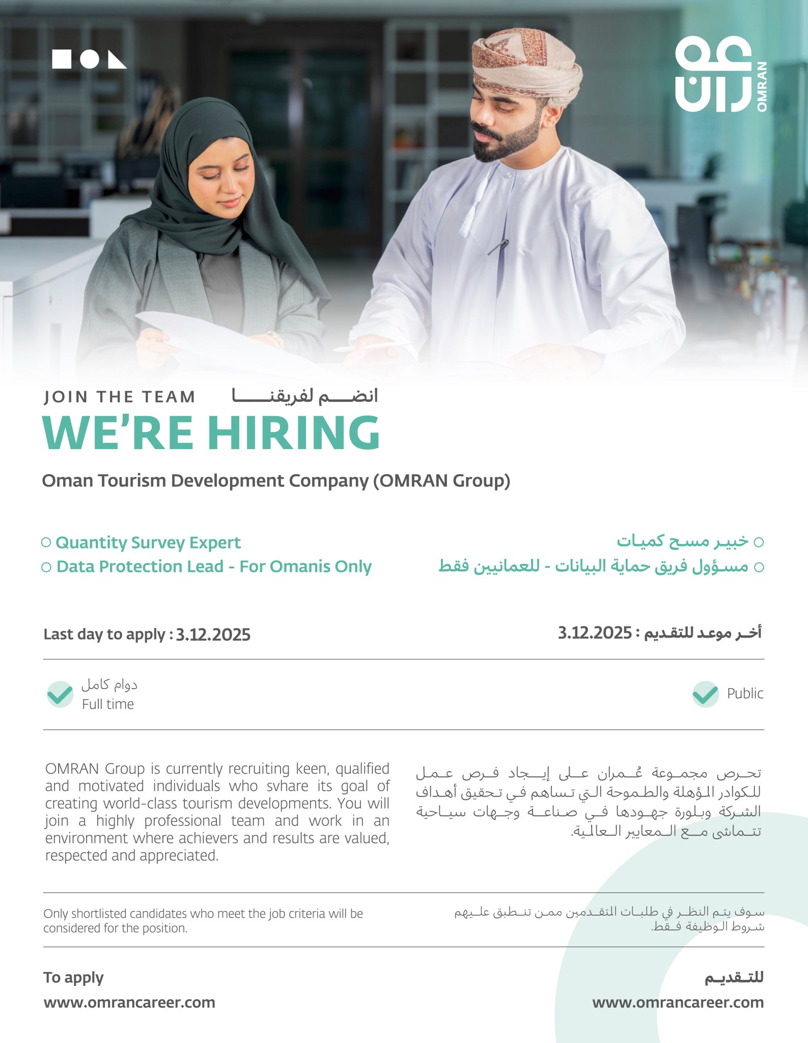 مجموعة عمران - فرص وظيفية شاغرة ( خبير مسح كميات + مسؤول فريق حماية البيانات )