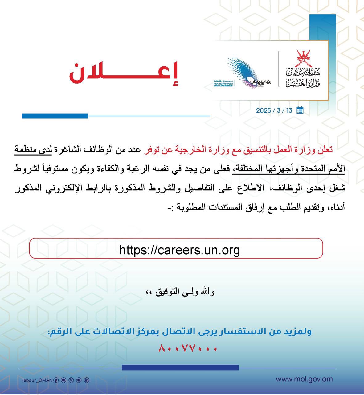 وزارة العمل بالتنسيق مع وزارة الخارجية توفر عدد من الوظائف الشاغرة لدى منظمة الأمم المتحدة وأجهزتها المختلفة
