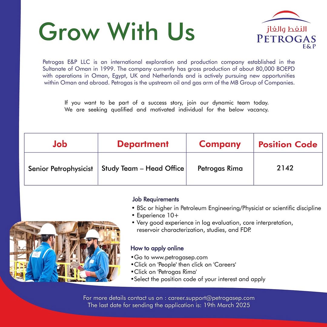 شركة النفط والغاز PETROGAS - وظيفة شاغرة ( Senior Petrophysicist )