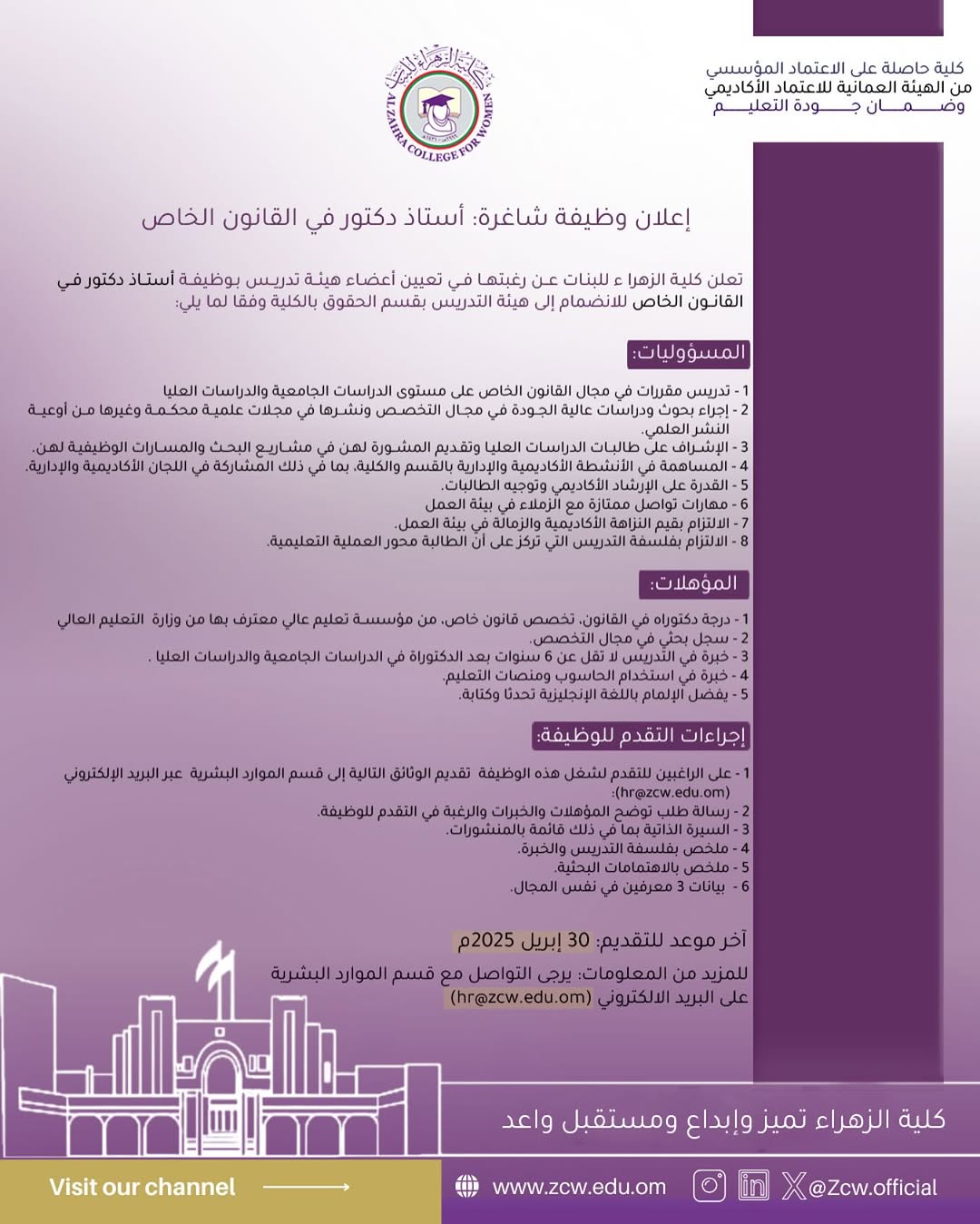 كلية الزهراء للبنات - وظائف تدريسية شاغرة