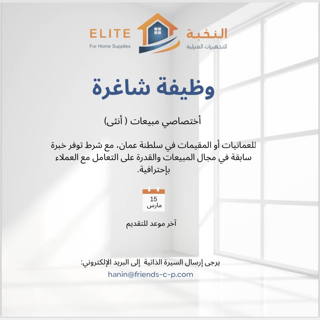 النخبة للتجهيزات المنزلية - وظيفة شاغرة ( أختصاصي مبيعات أنثى )