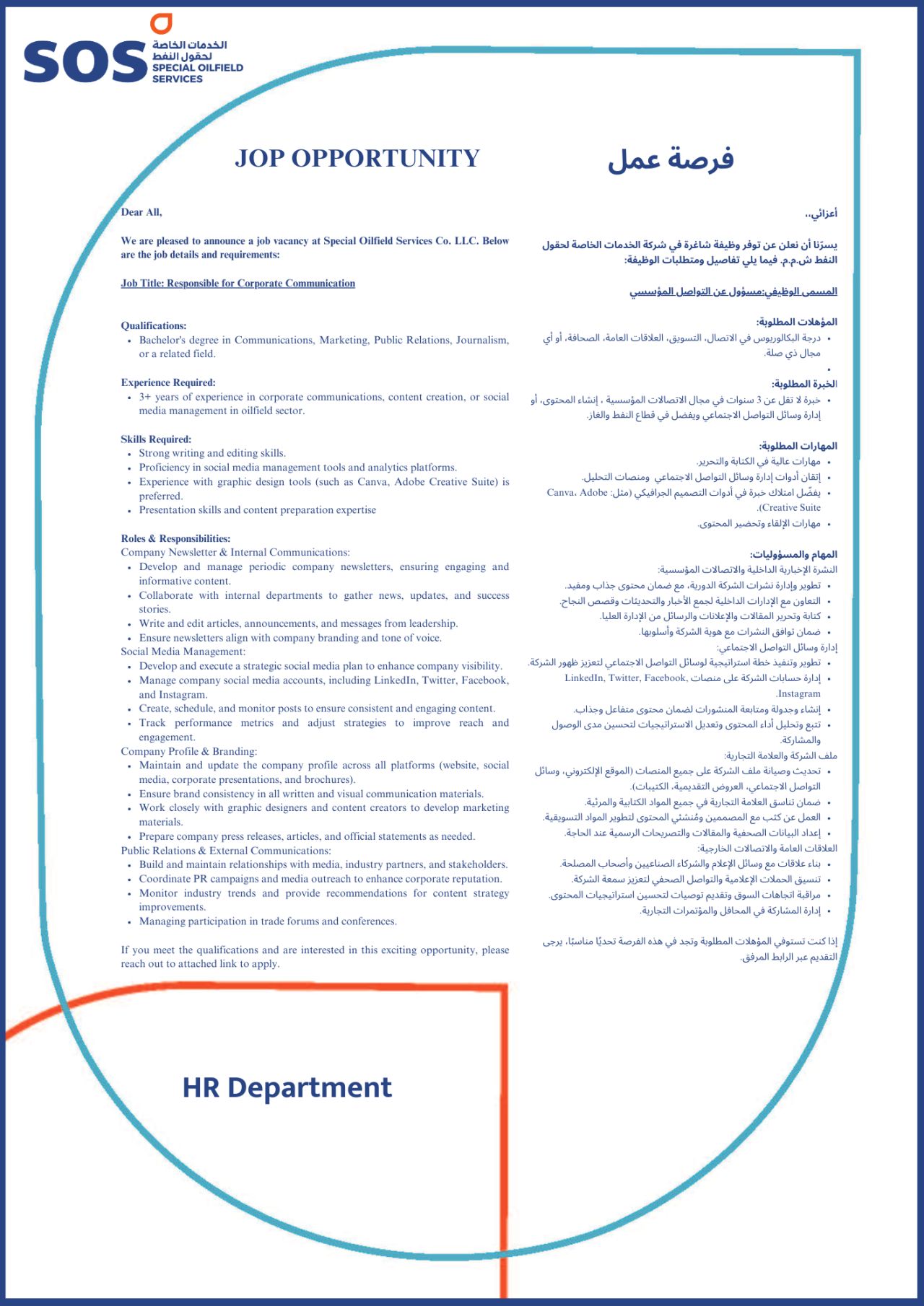 شركة الخدمات الخاصة لحقول النفط - وظيفة شاغرة ( مسؤول عن التواصل المؤسسي )