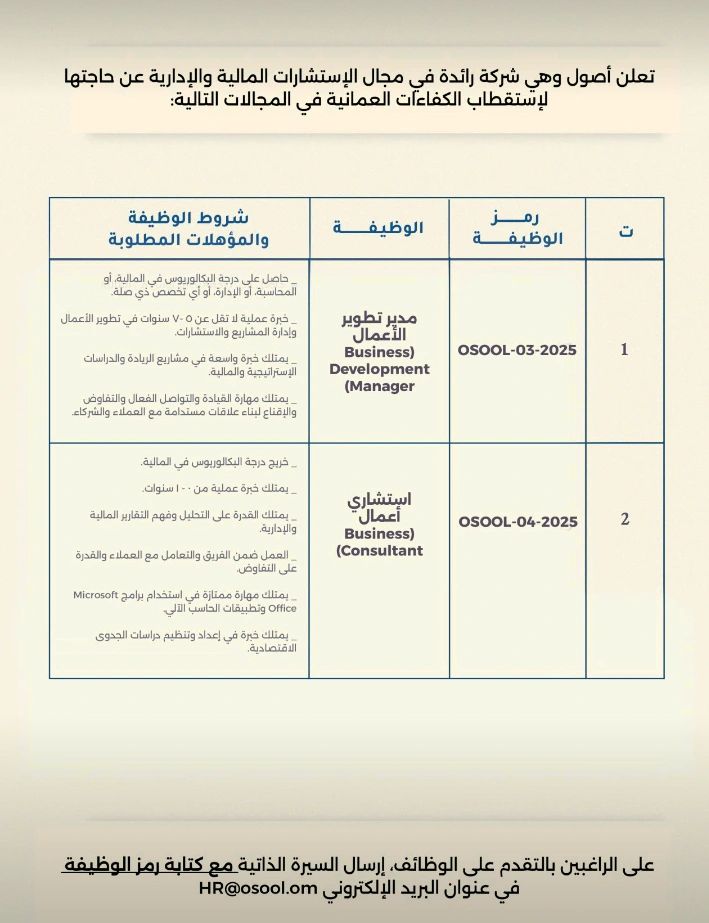شركة أصول الرائدة في مجال الإستشارات المالية والإدارية - وظائف شاغرة