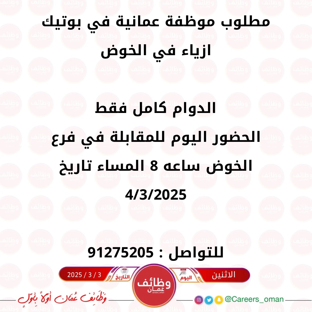 بوتيك أزياء في الخوض - وظيفة شاغرة ( موظفة )