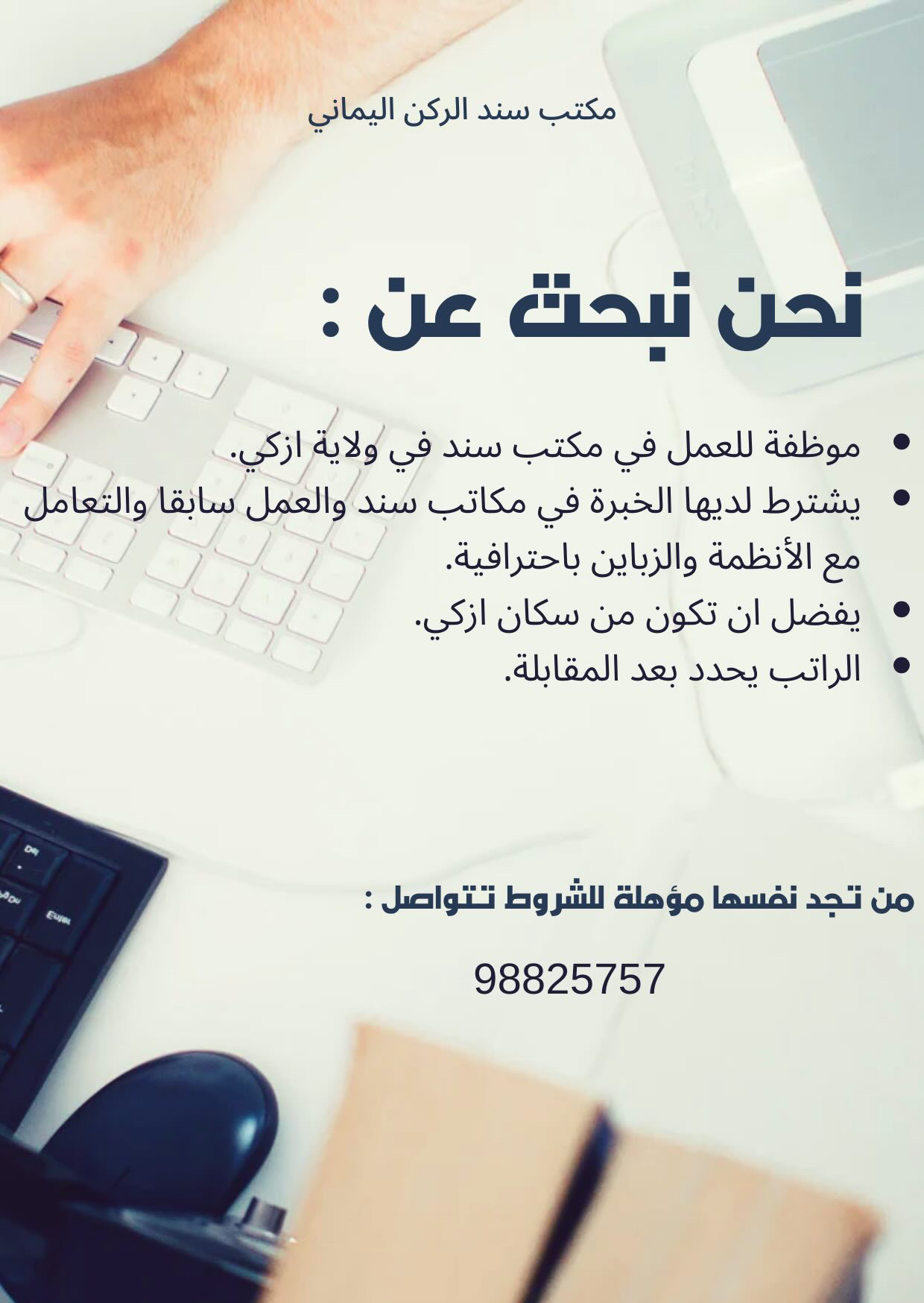 مكتب سند الركن اليماني في ولاية ازكي - وظيفة شاغرة ( موظفة )