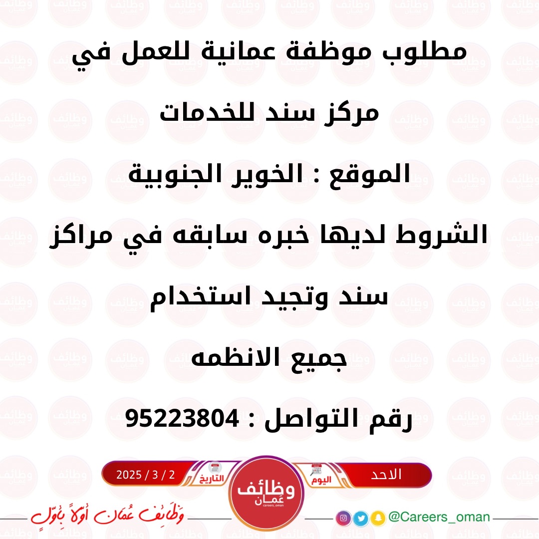 مكتب سند للخدمات في الخوير الجنوبية - وظيفة شاغرة ( موظفة )