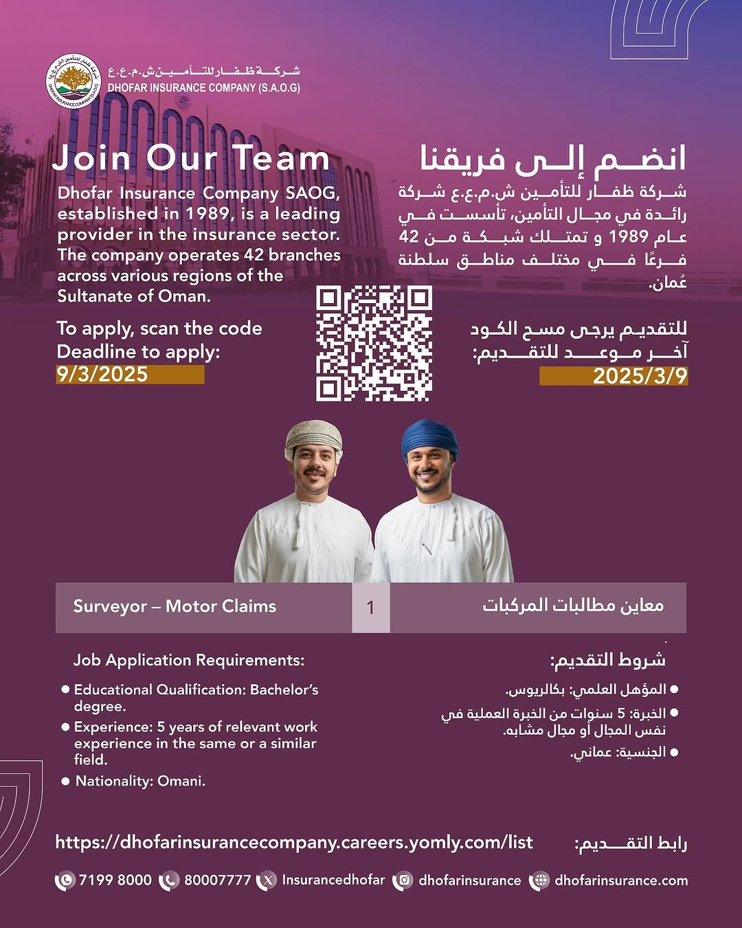 شركة ظفار للتأمين - وظيفة شاغرة ( معاين مطالبات المركبات )