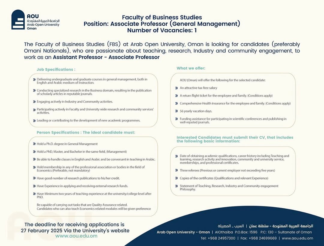 الجامعة العربية المفتوحة - وظيفة شاغرة ( Associate Professor (General Management )