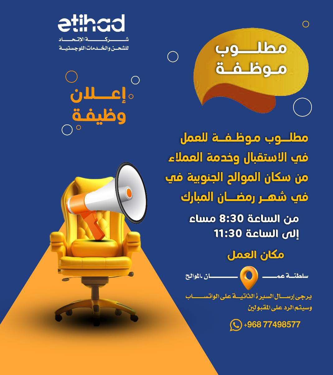 شركة الاتحاد للشحن والخدمات اللوجستية في مسقط - وظيفة شاغرة ( موظفة استقبال وخدمة العملاء )