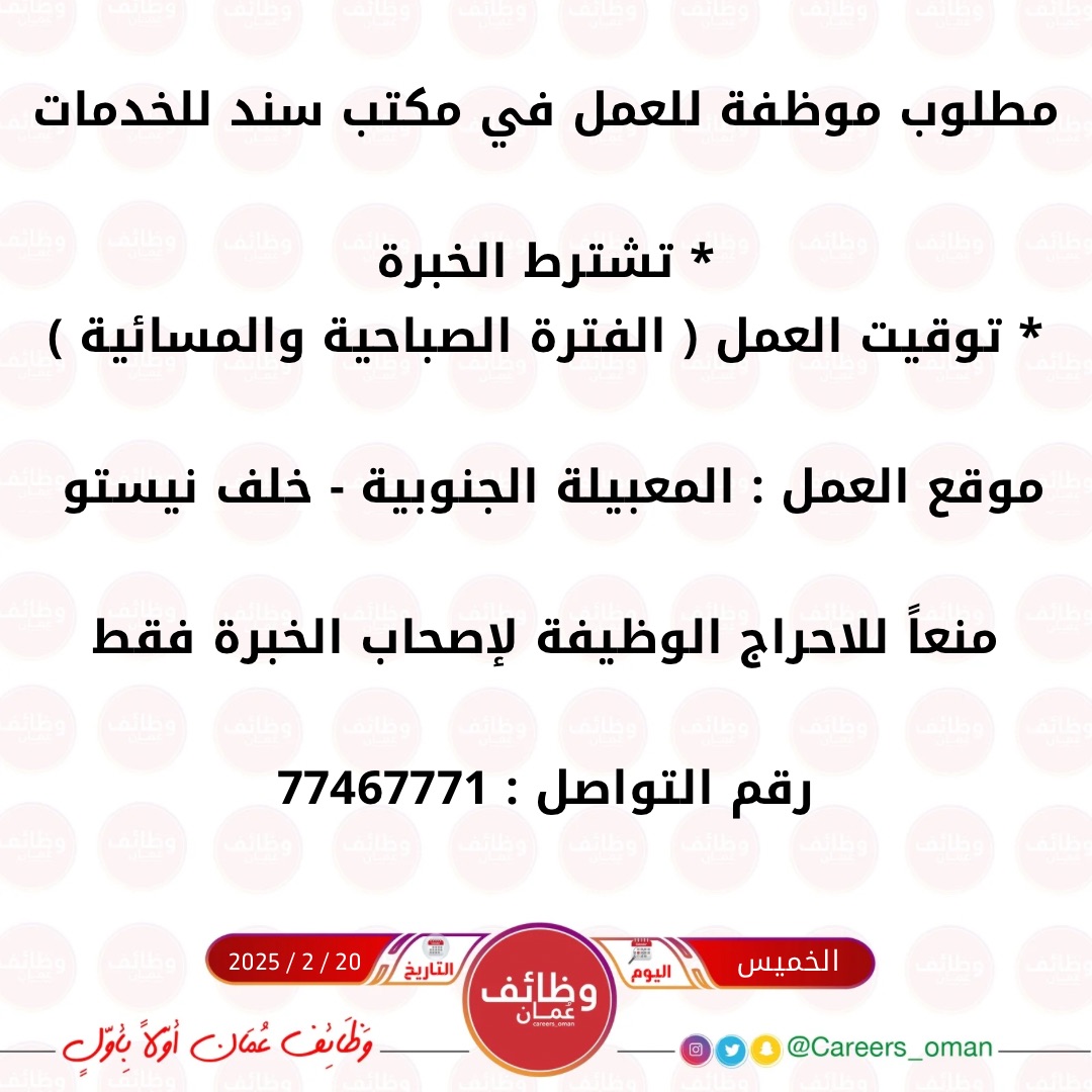 مكتب سند للخدمات في المعبيلة الجنوبية - وظيفة شاغرة ( موظفة )