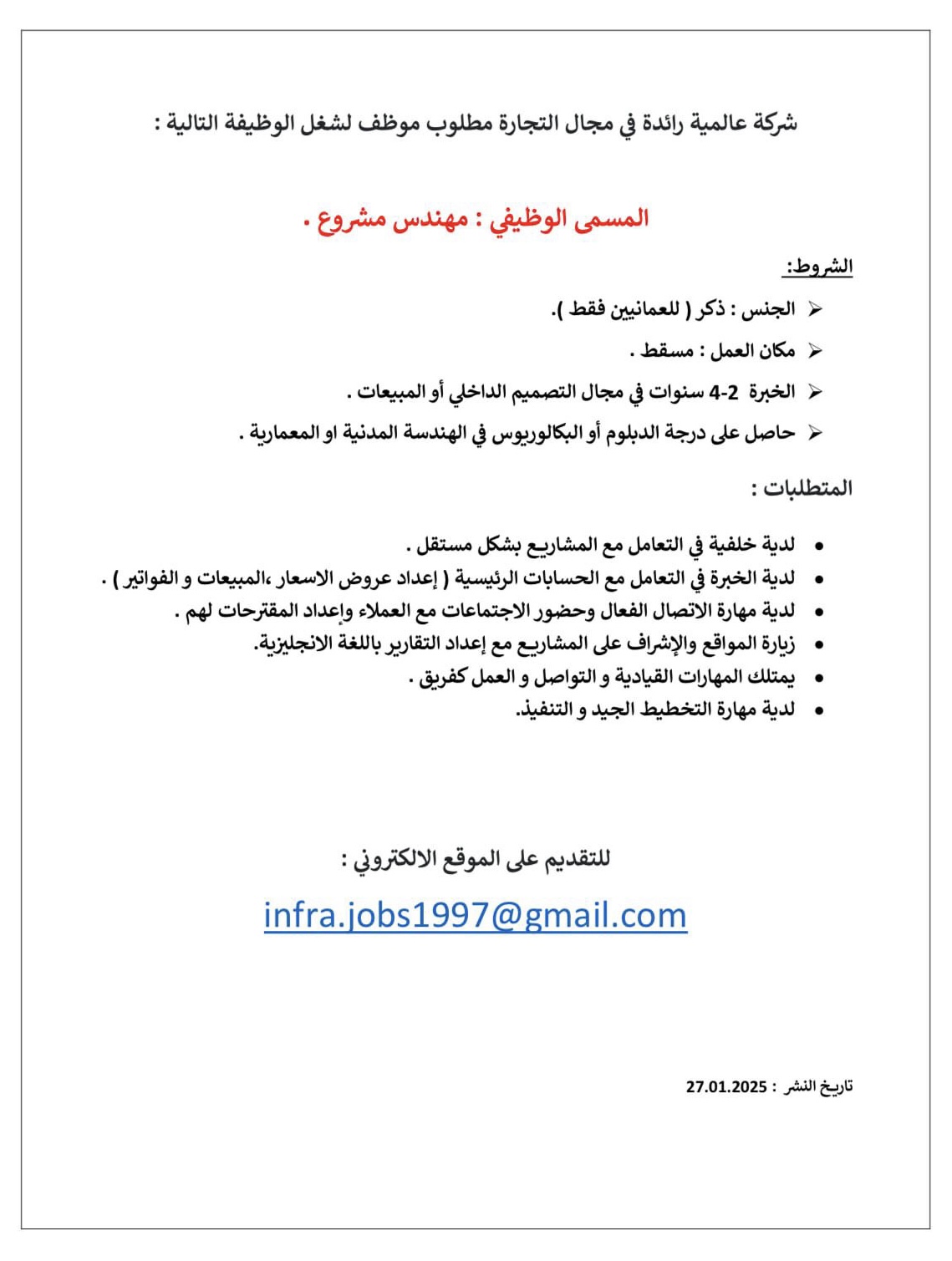 شركة عالمية رائدة في مجال التجارة في مسقط - وظيفة شاغرة ( مهندس مشروع )