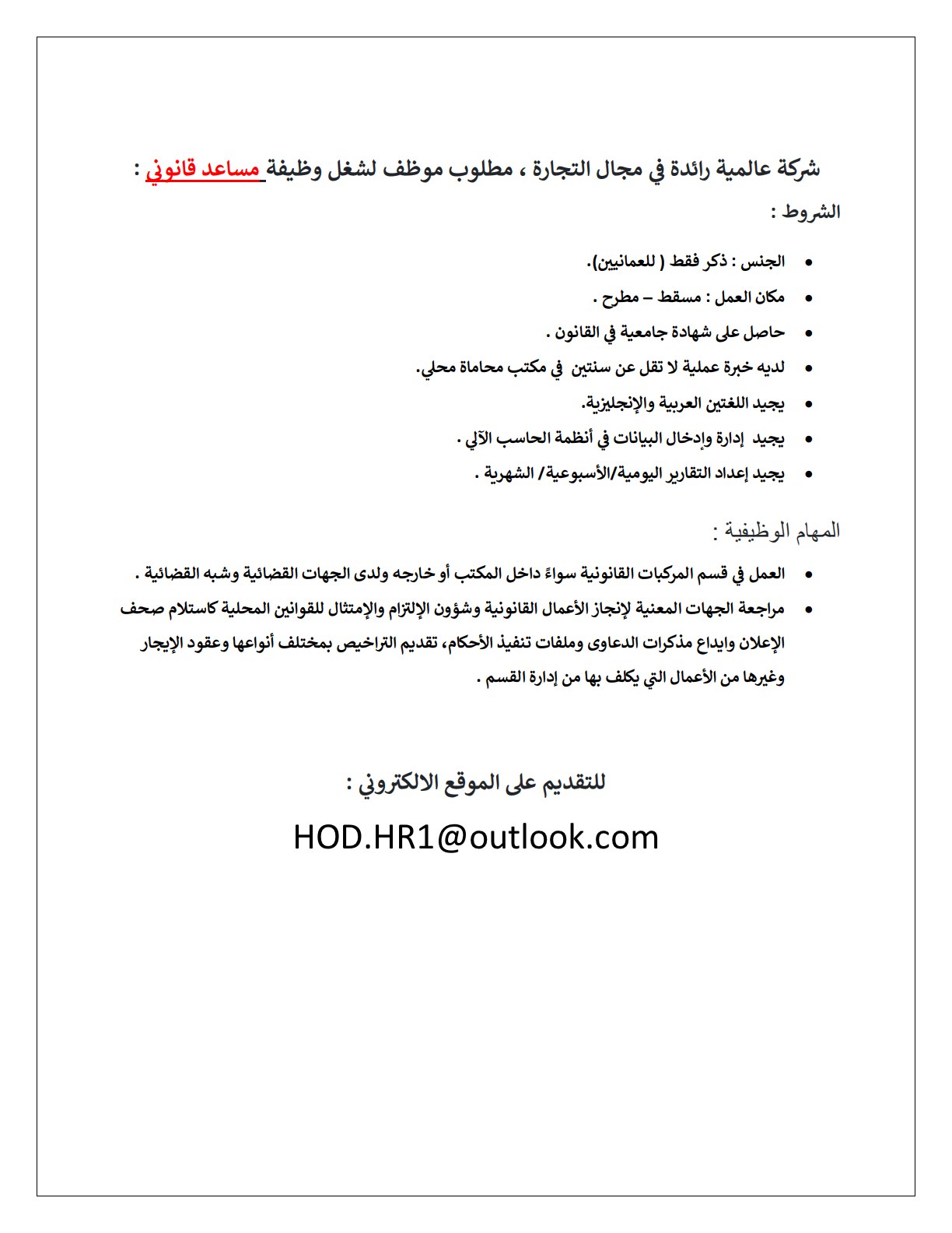 شركة عالمية رائدة في مجال التجارة في مسقط - وظائف شاغرة ( مساعد قانوني + مهندس مدني )