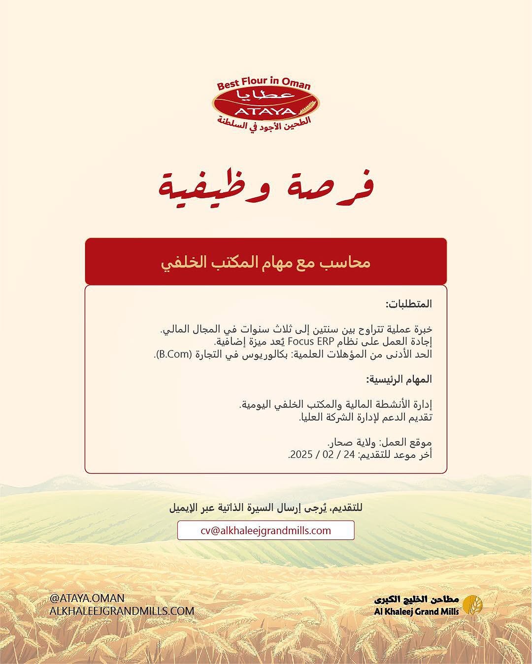 شركة مطاحن الخليج الكبرى في صحار - وظيفة شاغرة ( محاسب )