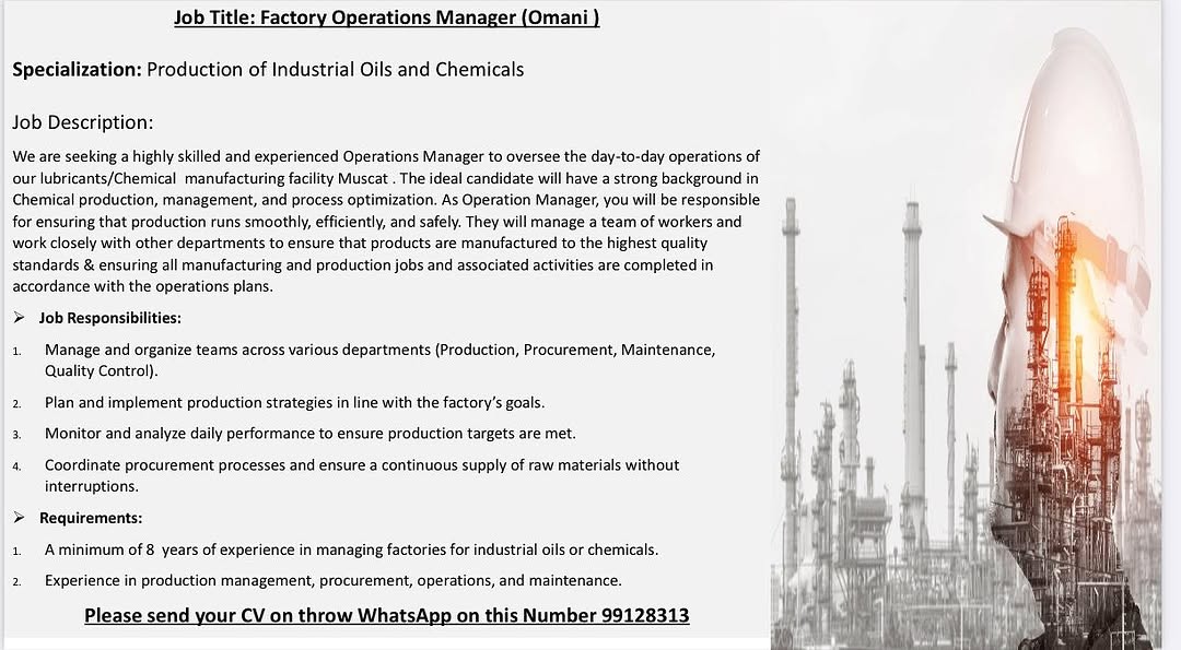 شركة رائدة في مجال المواد الكيماوية بمسقط - وظيفة شاغرة ( مدير عمليات المصنع )