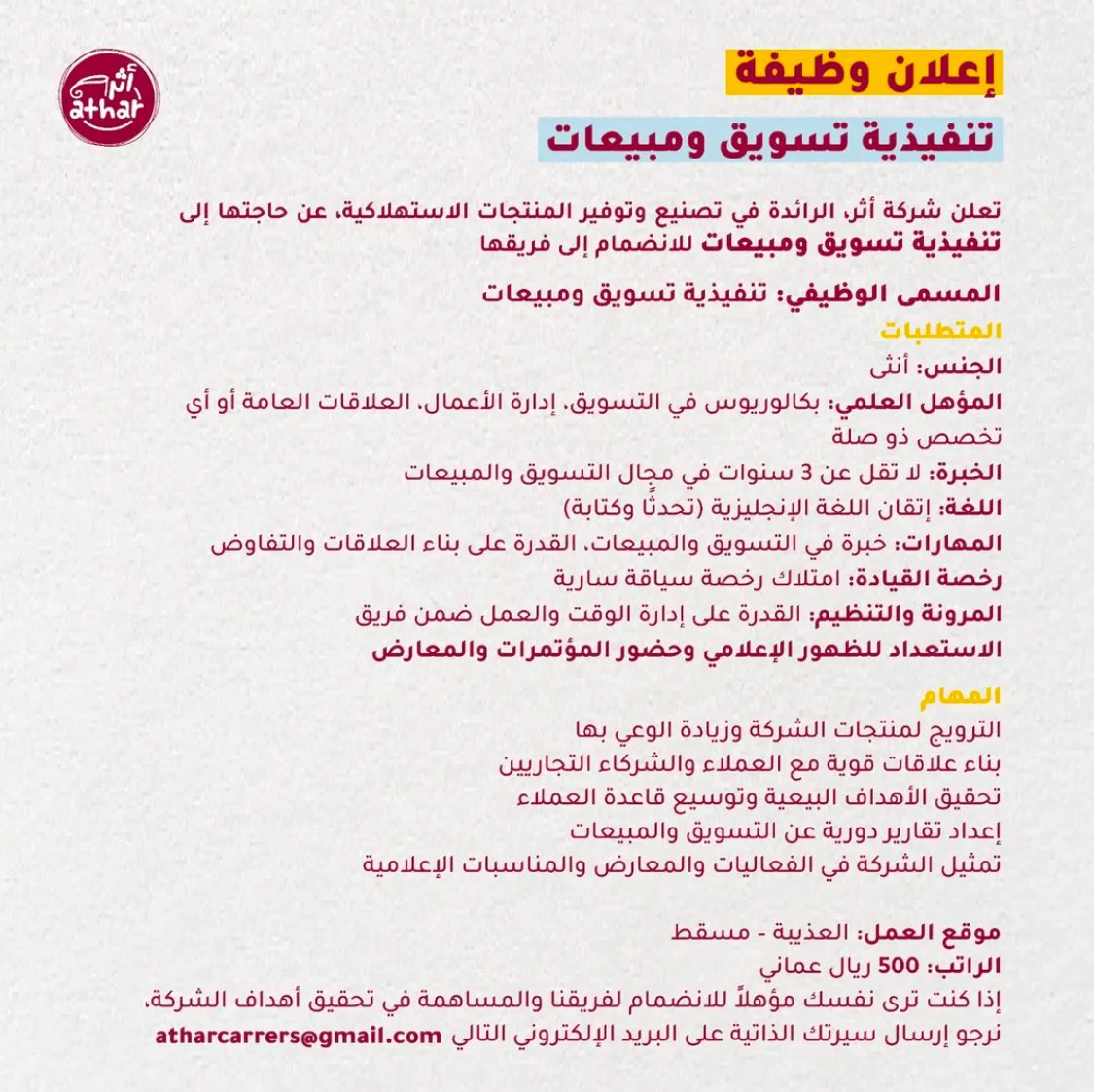 شركة أثر - وظيفة شاغرة ( تنفيذية تسويق ومبيعات )