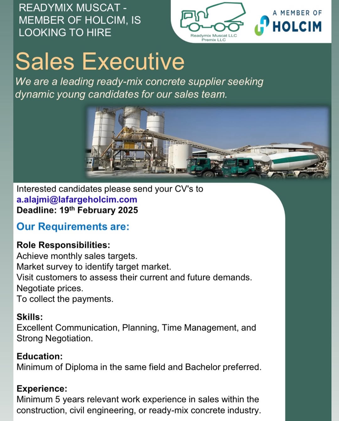 شركة مسقط ريدي ميكس - وظيفة شاغرة ( Sales Executive )