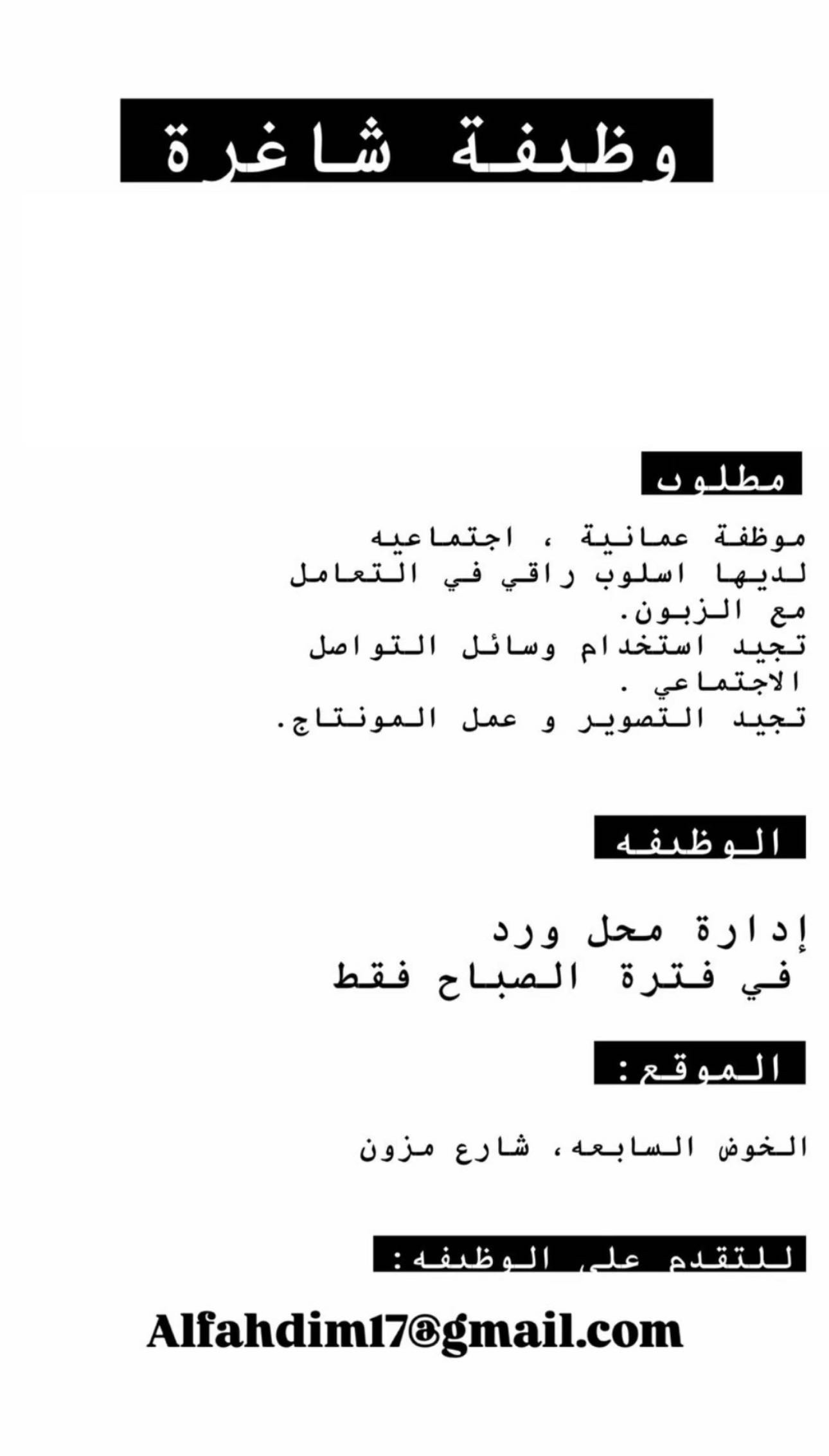 محل ورد في الخوض - وظيفة شاغرة ( موظفة )