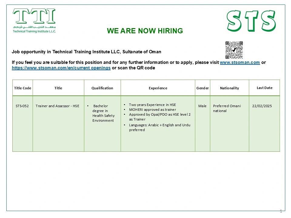 معهد التدريب الفني في مسقط - وظيفة شاغرة ( مدرب الصحة والسلامة المهنية )