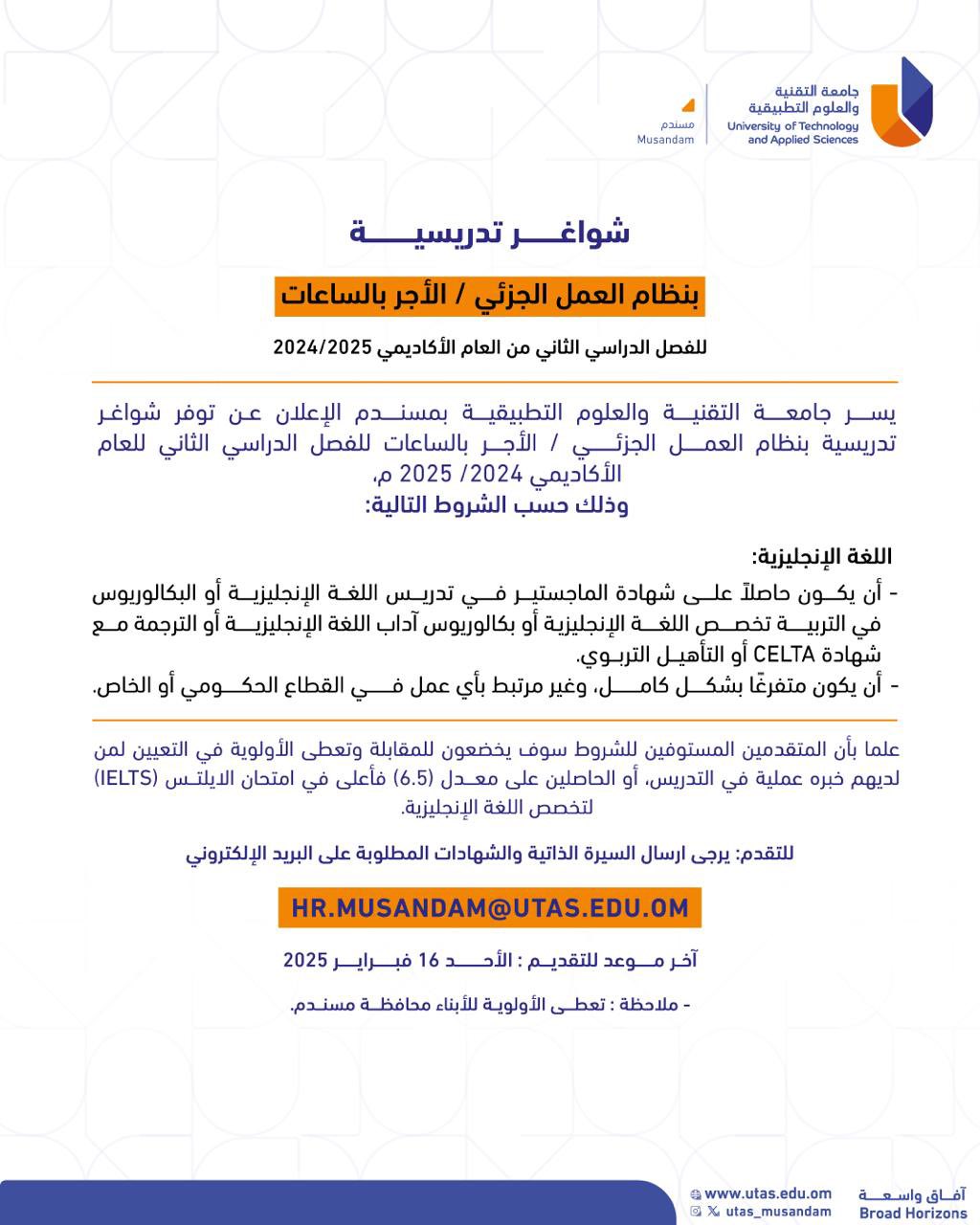 جامعة التقنية والعلوم التطبيقية بمسندم - توفر شواغر تدريسية بنظام العمل الجزئي