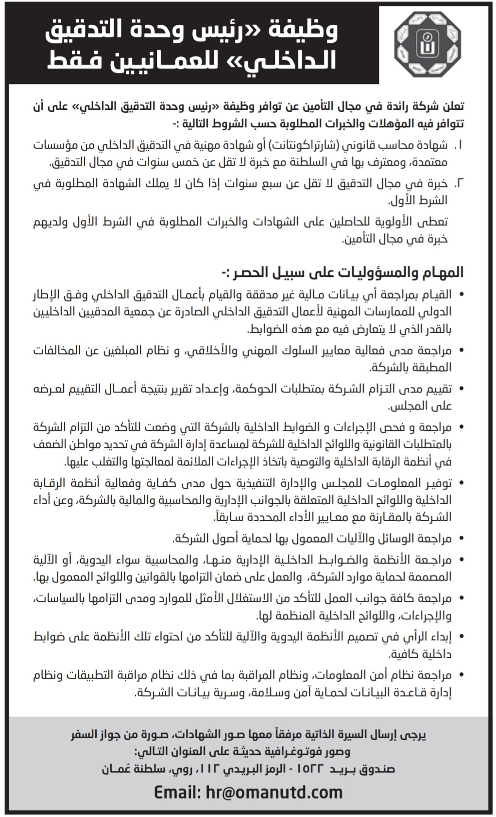 شركة رائدة في مجال التأمين - وظيفة شاغرة ( رئيس وحدة التدقيق الداخلي )