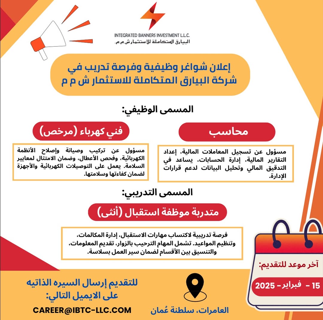 شركة البيارق المتكاملة للاستثمار في مسقط - وظائف شاغرة وفرص تدريبية ( محاسب + فني كهرباء + متدربة موظفة استقبال )
