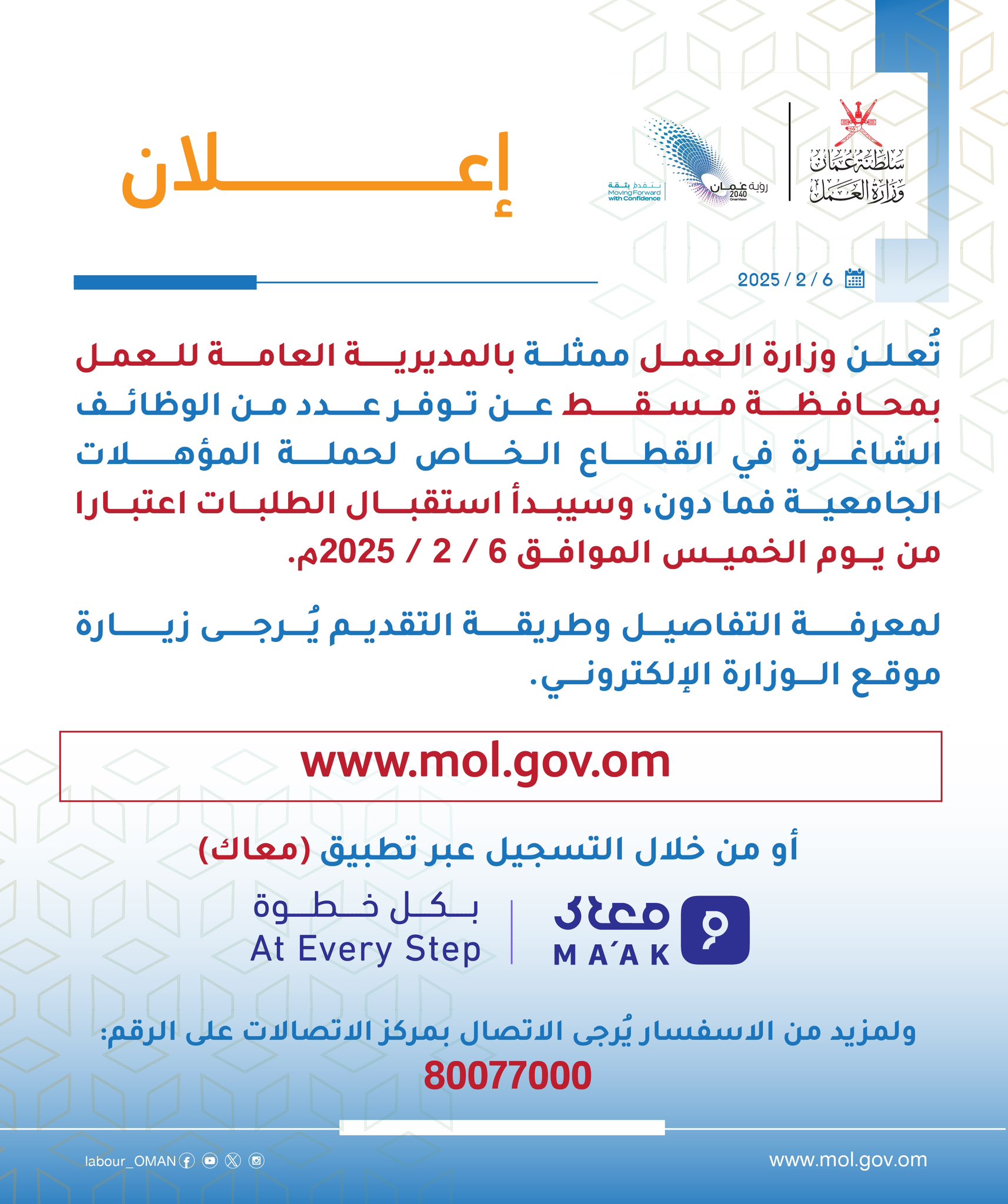 وزارة العمل - ممثلة بالمديرية العامة للعمل بمحافظة مسقط عن توفر عدد من الوظائف الشاغرة في القطاع الخاص لحملة المؤهلات الجامعية فما دون