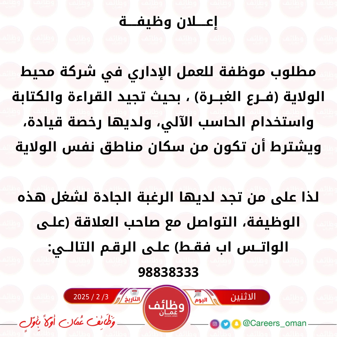 شركة محيط الولاية فرع الغبرة - وظيفة شاغرة ( موظفة )